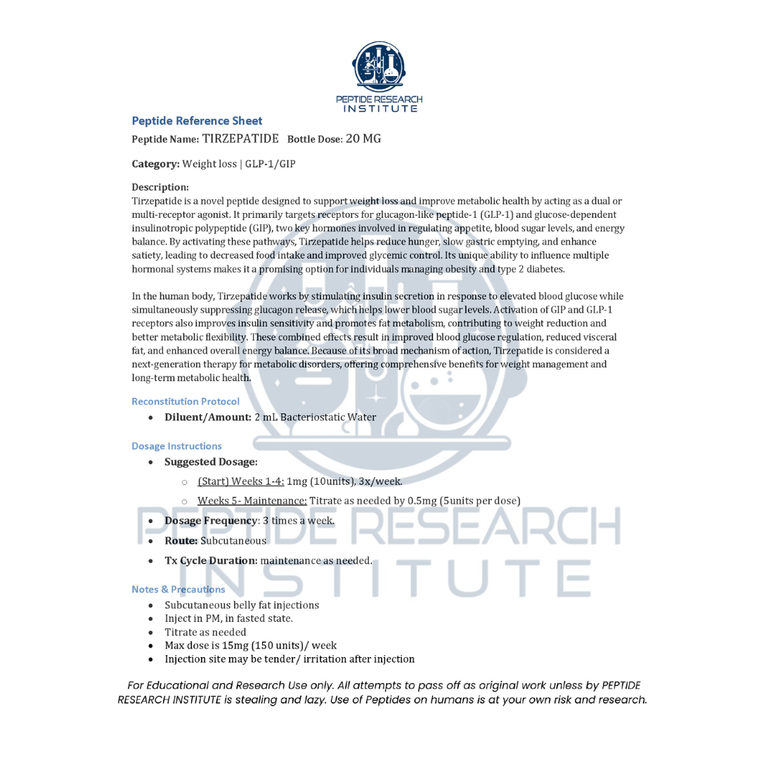 Tirzepatide is a groundbreaking peptide that acts as a dual GLP-1 and GIP receptor agonist, making it one of the most effective treatments for fat loss and metabolic health. By combining the effects of both glucagon-like peptide 1 (GLP-1) and gastric inhibitory polypeptide (GIP), Tirzepatide works to reduce appetite, improve insulin sensitivity, enhance glucose metabolism, and accelerate fat burning. Its dual mechanism of action helps to reduce hunger and food intake while boosting energy expenditure and promoting fat oxidation, making it one of the most powerful tools for weight management. In clinical studies, Tirzepatide has shown impressive results, with individuals losing up to 20-25% of body weight, while also improving cardiovascular health and metabolic markers like blood pressure and cholesterol.